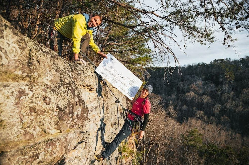 Former SCC Executive Director, Andrea Hassler passes a giant check to Access Fund Vice President of Programs and Acquisitions Zachary Lesch-Huie to signify the payoff of Denny Cove which was purchased through Access Fund's revolving Climbing Conservation Loan Program. Ancestral lands of Cherokee, Shawnee, and Yuchi. © Nathalie DuPre